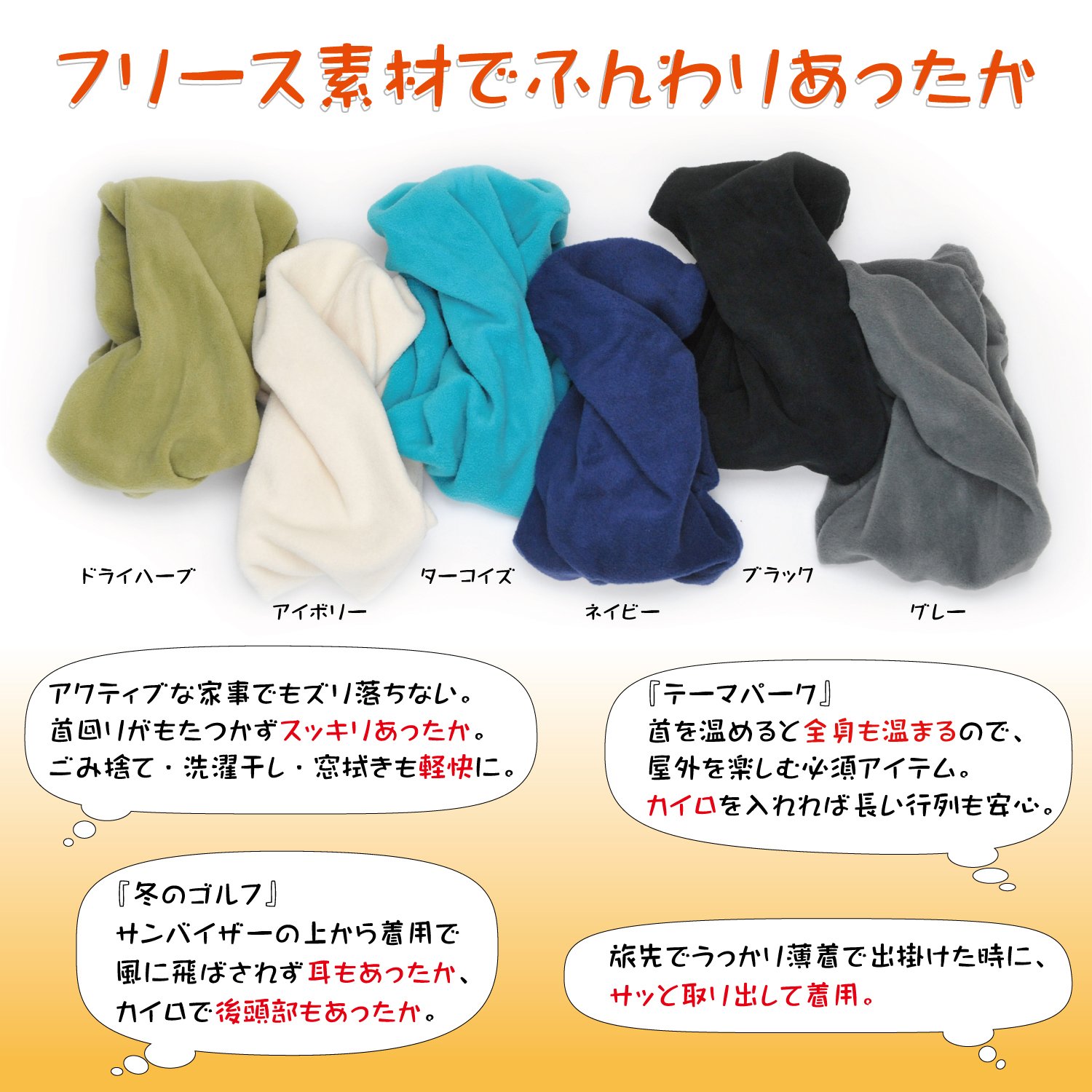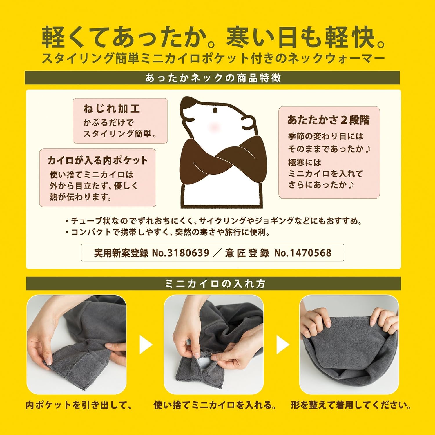 サイズ:幅約20cm×首回り45~64cm サイズ:幅約20cm×首回り45~64cm 素材:ポリエステル96%、ポリウレタン4% 家庭用洗濯機可 あたたかさ2段階。季節の変わり目にはそのままの使用で温かく、寒い時にはカイロを入れてさらにあったか。 ねじれ加工がされているので、着用するだけでスタイリング簡単。 カイロが入る内ポケット付き。使い捨てのミニカイロは外から目立たず、優しく熱が伝わります。