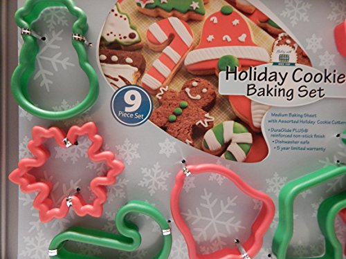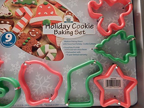 Christmas Baking Pan / Holiday Cookie Sheet with Assorted Christmas Cookie Cutters 9 Pc. Set (8 Holiday Cookie Cutters - Gingerbread man, Snowflake, Snowman, Stocking, Christmas Tree, Candy cane)