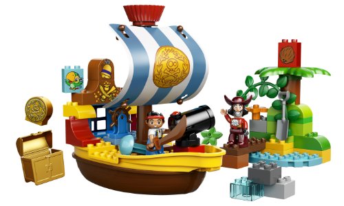 Stop Captain Hook from sneaking onboard Jake's Pirate Ship Bucky and taking the treasure! Spot him from the turning lookout tower, fire the cannon and hoist the sail to evade that pesky pirate. Escape to the island and bury the treasure where no one will find it! Build a swashbuckling pirate ship adventure from Disney's® Jake and the Never Land PiratesTM animated series. Includes LEGO® DUPLO® Jake and Captain Hook figures. 56 pcs. Ages 2 yrs. +.Feature