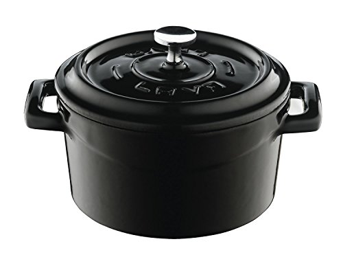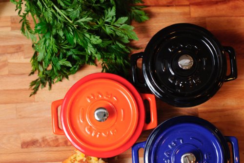 This is Lava’s Signature Round Mini Dutch Oven. It is 4-1/2 inches wide and holds 12 ounces of culinary goodness. It is the perfect way to present an individual serving of delicious enjoyment and it comes in many beautiful colors. Lava makes Mini Dutch Ovens just like it makes large ones, with three layers of beautiful porcelain enamel outside and a special chef preferred, black matte finish inside. The enamels are bonded into premium cast iron that is fired twice for maximum beauty, durability and cooking performance. Only the best cookware in the world is made this way. Mini Dutch Ovens are the perfect solution for yummy personal sized entrées, interesting hot or cold appetizers or tempting desserts. Enameled cast iron cooks more evenly, predictably and deliciously than other small pots. It’s beautiful design and individual serving style offers delightful presentation options for many recipes.Feature