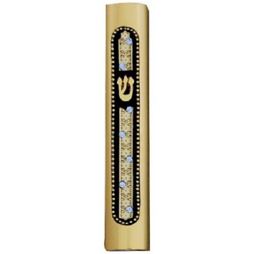 Mezuzah - Handmade Jeweled Home Blessing Cover, Aluminum - Gold With Black and Stone Design, 7 Centimeters