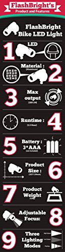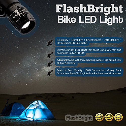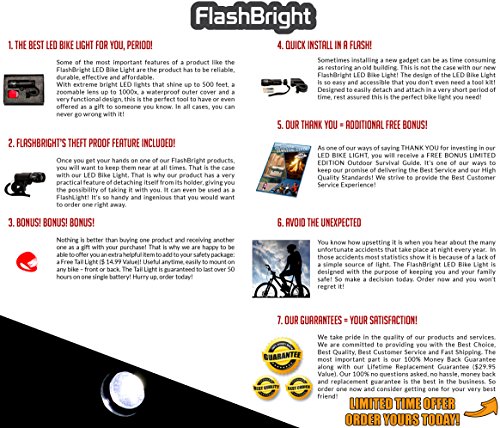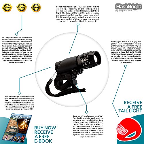 - Feature : THE BEST LED BIKE LIGHT FOR YOU PERIOD! THE EXTREMELY BRIGHT LED LIGHTS ILLUMINATE YOUR PATH AND IMPROVE YOUR SAFETY BY INCREASING YOUR VISIBILITY TO ANY ONCOMING CARS. OUR FREE BONUS TAIL LIGHT ($14.99 Value) HAS YOUR BACK COVERED AS WELL! The FlashBright LED Bike Light Shine up to 500 Feet, Has a Zoomable Lens up to 1000x and Comes With a Waterproof Outer Cover Making this Bike Light the Perfect Tool to Have Rain or Shine. / QUICK INSTALL IN A FLASH - NO TOOLS REQUIRED - THEFT PROOF FEATURE INCLUDED! Designed to Easily Attach and Detach on Any Bike in Seconds Without Any Tools using Our Quick Release Technology. It Can Even be Used as a FlashLight! It's so Handy and Ingenious, This is the Perfect Bike Light You can Buy Anywhere! / MULTIPLE POWER SETTINGS FOR ANY SITUATION DAY OR NIGHT - RAIN OR SHINE! Three Power Settings, HIGH, LOW & FLASHING Make this TOOL the Most Versatile Bike Light on the Market. Use the Flashing Mode in Daylight to Ensure You Will Be Seen by Any Vehicles in Your Path. NEVER ride blind or without being seen again! Instead of Carrying Flashlight, Quickly Unmount Your Light for Use Anywhere, Anytime, In or Out of the House. Great for Camping, Hiking, Fishing, Walking, Running and Most Importantly Biking! / ENSURE THE SAFETY OF YOU AND YOUR FAMILY - AVOID THE UNEXPECTED! Most Statistics Show That the Accidents That Take Place at Night are Due to A lack of a Simple Source of Light. The FlashBright LED Bike Light was Designed to Protect You and Your Kids. HIGHEST QUALITY MILITARY GRADE CONSTRUCTION - Made of the Highest Quality Aluminum and Components This Bright, Waterproof LED Light Shines Up to 500 Feet Lighting Up Your Path Every Time, Rain or Shine. You Will Be Seen and Protected. It's Critical to Use a Bike Light, Especially at Night. Invest in Your Family's Safety! / OUR QUALITY + OUR GUARANTEES = YOUR SATISFACTION! - 100% SATISFACTION OR YOUR MONEY BACK - We Take Pride in the Quality of Our Products and Services. We are Committed to Providing You With The BEST CHOICE, BEST QUALITY, BEST CUSTOMER SERVICE, FAST SHIPPING and a LIFETIME REPLACEMENT GUARANTEE. ($29.99 Value). For a LIMITED TIME ONLY Besides Receiving the FREE Tail Light ($14.99 Value), You Will Receive Our LIMITED EDITION Outdoor Survival Guide ($12.99 Value) When You Register Your Bike Light For it's LIFETIME WARRANTY. It's One of Our Ways to Keep Our Promise of Delivering The Best Service and Meet Our High Quality Standards. We Strive to Provide the Best Customer Service Experience! We Believe Our 100% No Questions asked, No Hassle, Money Back or Replacement Guarantee is the Best in the Business. For More Details See the Product Description Below or Just Order One Now and Consider Getting Another for a Loved One or Your Very Best Friend!