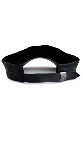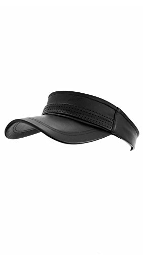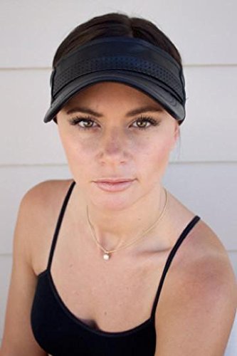 Product Description Sporty luxe vegan leather tennis visor with perforated trim detail at front, curved brim, and leather strap adjustable closure with custom gunmetal hardware. Adjustable, One size fits all. 0