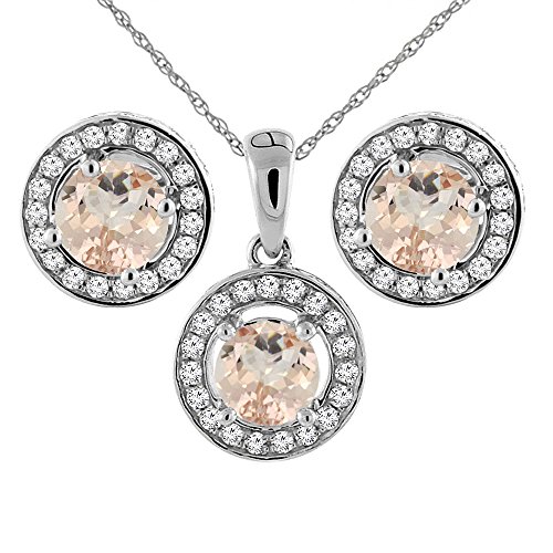 -. Title : 14K White Gold Natural Morganite Earrings and Pendant Set with Diamond Halo Round 5 mm