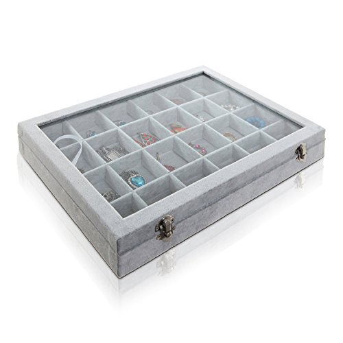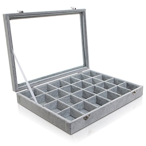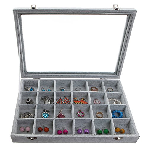 -. Feature : A charming 24-slot gray velvet jewelry display box. / Boasts a hinged lid with a see-through surface for showing off your favorite accessories. / Ideal for keeping items like rings, earrings, and bracelets organized and neat. / **Official MyGift® product. Jewelry pictured not included.** / Approximate Dimensions (in inches): 13.9 W X 9.7 H X 2 D.