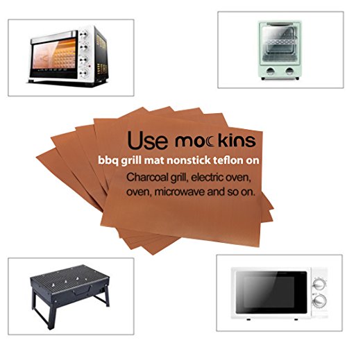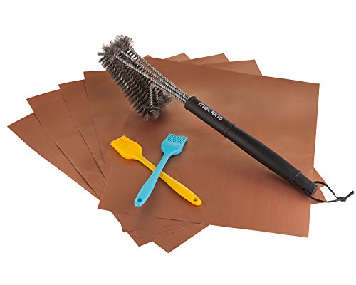 mockins Premium BBQ Mats Set - Includes 5 Gold/Copper Non Stick BBQ Grill Mats - 2 Silicone Basting Brushes - And 1 Steel wire Cleaning Brush For All Your Grilling And Cooking Needs … … …