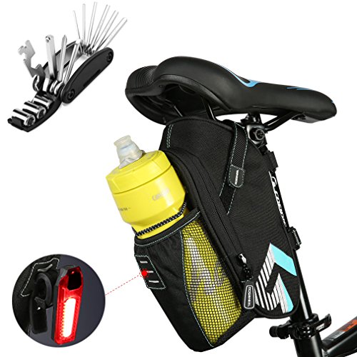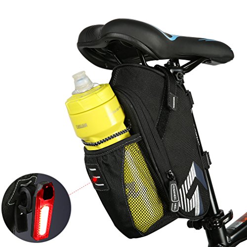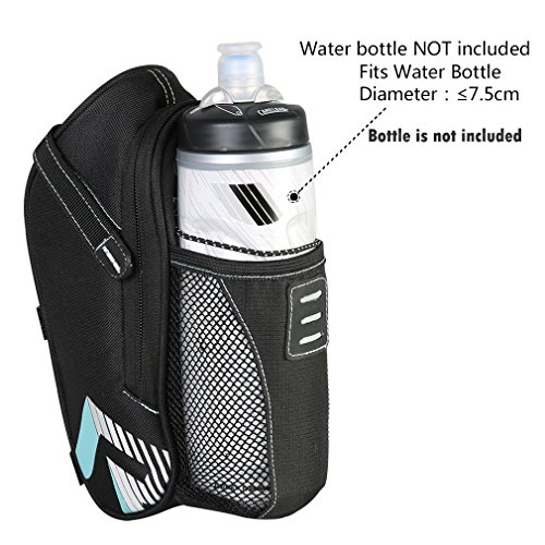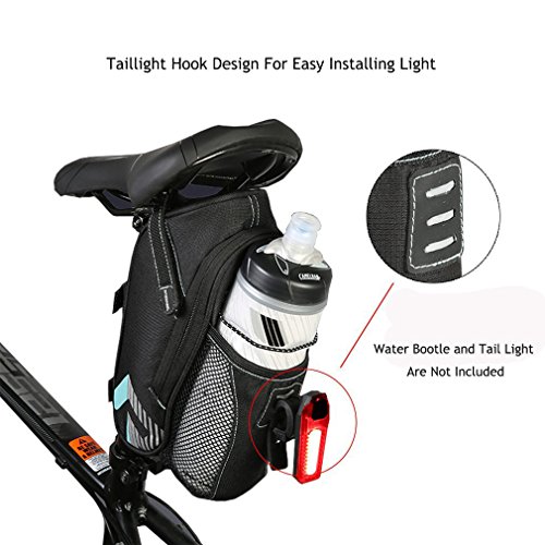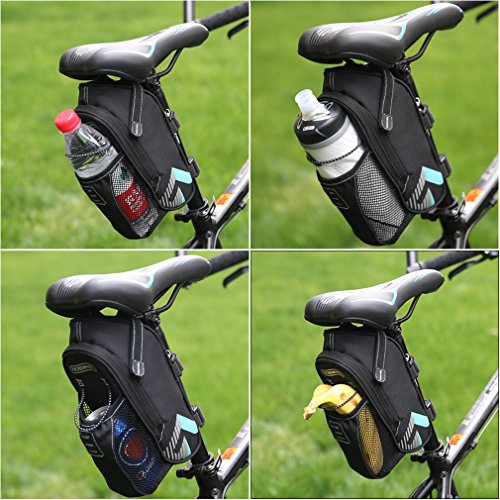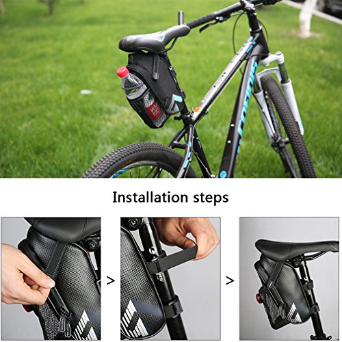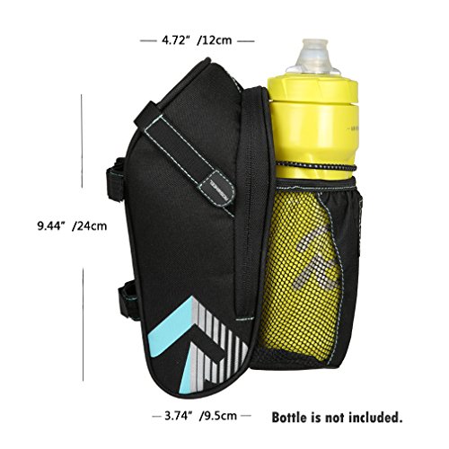 CAPACIOUS BIKE SADDLE POUCH WITH EXTRA WATER BOTTLE HOLDER: The solid Bicycle seat pack is roomy enough for repair multitool, full wallet, phone, snacks, keys and other essentials. Moreover, there is a bottle holder for your drink or other items.(Water bottle diameter: ≤ 7.5cm, NOT INCLUDED) Size: 9.44*3.74*4.72inch/24*9.5*12cm(L * H * W), Weight: 140g