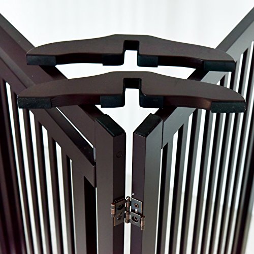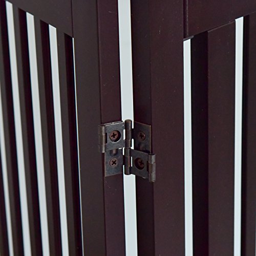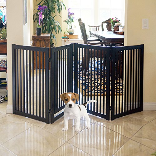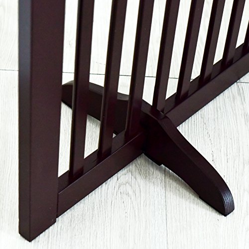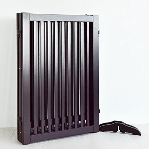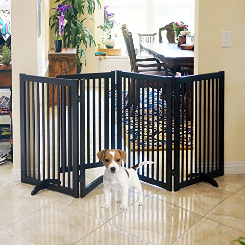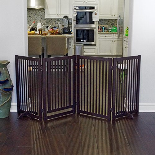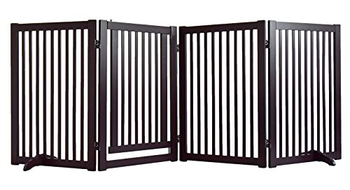 Freestanding 4-Panel wood pet gate with Walk-thru door allows easy movement between spaces, folds down to store easily. RUBBER PADS: add rubber pads at the bottom of pet gates to prevent sliding and keeps floors safe from scratching. A PAIR OF FEET: A pair of sturdy support feet is a plus to provide extra stability and prevent tipping. Perfect for doorways, hallways, entryways, stairs, home and more. APPROXIMATE SIZES: 4 panels, total: 88-Inch x 32-Inch x 3/4-Inch when completely extended. Each panel: 32-Inch x 22-Inch x 3/4-Inch). 0