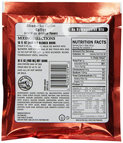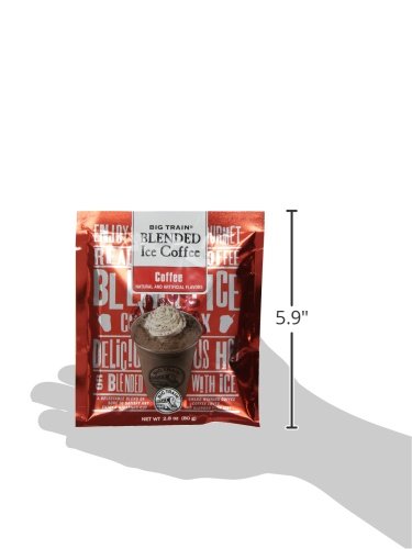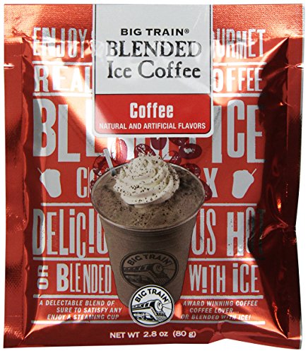 -. Binding : Grocery -. Brand : Big Train -. EAN : 0642628035592 -. Feature : Case of 25 2.8-ounce single serving pouches of coffee flavored iced coffee mix (70 total ounces) / An eye-opening blend of Arabica coffee and rich coffee flavor / Simply blend with coffee, milk or water to make a refreshing 16-ounce treat / Conveniently packaged in single-serving packs / Product of USA; Big Train is based in Foothill Ranch, California and distributes its drinks to coffee houses and retail outlets throughout the world -. Label : Big Train -. Manufacturer : Big Train -. Model : BT.600550.JG4 -. NumberOfItems : 1 -. PackageQuantity : 25 -. ProductGroup : Grocery -. ProductTypeName : GROCERY -. Publisher : Big Train -. ReleaseDate : 2006-05-03 -. Studio : Big Train -. Title : Big Train Blended Ice Coffee, Coffee, 2.8-Ounce Bags (Pack of 25) -. UPC : 642628035592