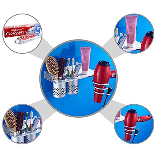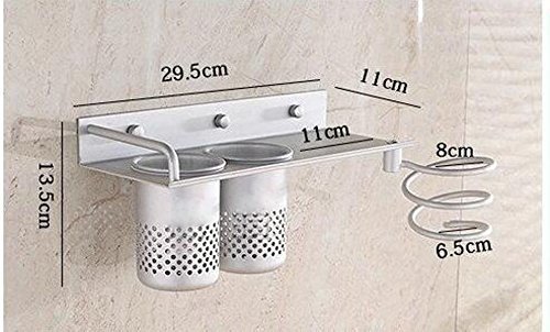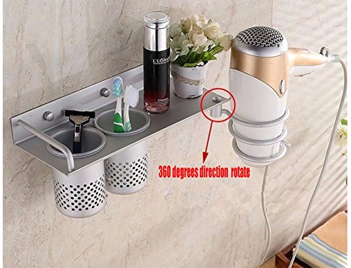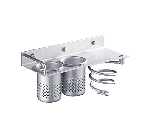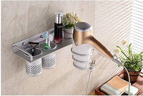 Yosoo Hair Dryer Holder Bathroom Storage Rack Aluminum Wall Mount Hair Dryer Hanging Rack Organizer with 2 Cups (C Sytle)
