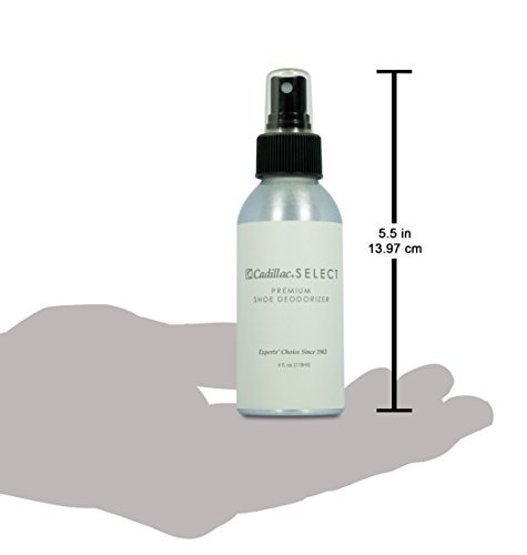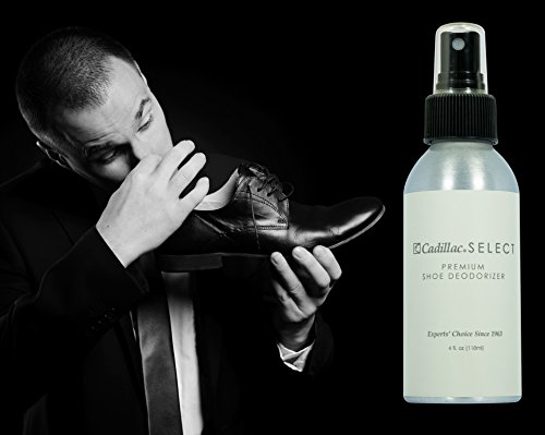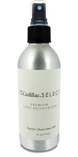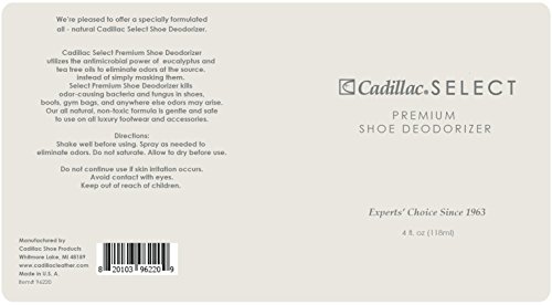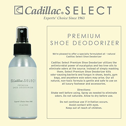 Product Description PRODUCT USE: Cadillac Select Premium Shoe Deodorizer utilizes the antimicrobial power of eucalyptus and tea tree oils to eliminate odors at the source, instead of simply masking them. Select Premium Shoe Deodorizer kills odor-causing bacteria and fungus in shoes, boots, gym bags, and anywhere else odors may arise. Our all-natural, non-toxic formula is gentle and safe to use on all luxury footwear and accessories. DIRECTIONS: Shake well before using. Spray as needed to eliminate odors. Do not saturate. Allow to dry before use. MADE IN THE USA: Cadillac is proud to produce all Select Premium Shoe Deodorizer in the United States of America. 0