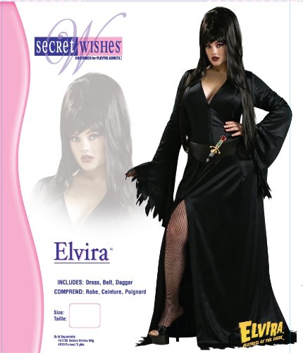 -. Binding : Apparel -. Brand : Secret Wishes -. ClothingSize : Plus Size -. Color : Black -. Department : womens -. Feature : Officially licensed Elvira long slinky black dress with long sleeves and slit / Includes belt and dagger / Plus sized costume designed to fit dress size 14 to 16, 40 to 42-inch bust, 36 to 38-inch waist / Fishnets and shoes available separately / Secret Wishes brings flirty fun to playful adults every day of the year -. Genre : TV/Movie Characters -. IsAdultProduct : 0 -. Label : Secret Wishes -. Manufacturer : Secret Wishes -. Model : 17545 -. MPN : RB17545 -. PackageQuantity : 1 -. PartNumber : RB17545 -. ProductGroup : Apparel -. ProductTypeName : ADULT_COSTUME -. Publisher : Secret Wishes -. Size : Plus 14-16 -. Studio : Secret Wishes -. Title : Secret Wishes Elvira Mistress of the Dark Full Figure Costume, Black