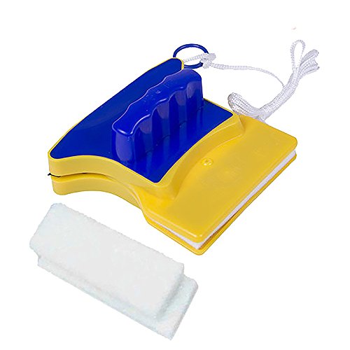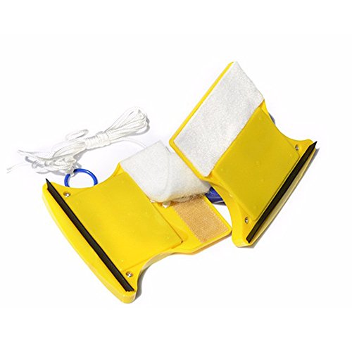 -. Feature : The powerful internal magnets lock the two cleaning sides together, so when you move one side, the other one follows. / Easy to clean and use. Safety Cord on one side to prevent dropping. / Environmentally friendly: all you need is warm water and plain detergent to clean. / Application Scope: Glass thickness 3-5mm. / It can be used to clean window, fish tanks, skylights, patio doors, bedroom windows and even shower screens, mirror and tiles.