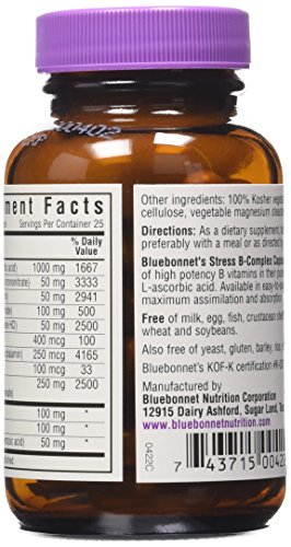 ReleaseDate : 2015-05-13 Studio : BlueBonnet Publisher : BlueBonnet Binding : Health and Beauty Product Description Bluebonnet's Stress B-Complex vegetable capsules provide a full spectrum of pure, high potency B vitamins plus 1,000 mg of vitamin C from L-ascorbic acid in easy-to-swallow vegetable capsules for maximum assimilation and absorption. This product contains all of the benefits of Bluebonnet's B-Complex with an added 1000mg of vitamin C to help boost the immune system. 0