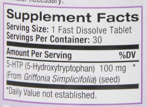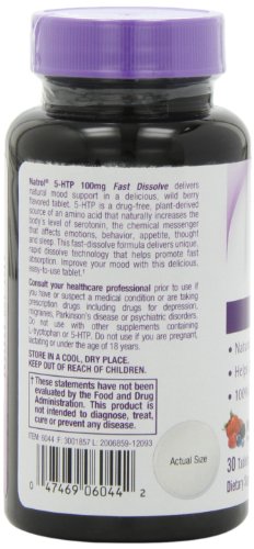 -. Binding : Health and Beauty -. Brand : Natrol -. Department : Health and Personal Care -. EAN : 5724544495492 -. Feature : Promotes positive mood. Helps control appetite promotes normal sleep with rapid dissolve technology to help promote fast absorption / Delicious, wild berry flavor / 100% vegetarian -. IsAdultProduct : 0 -. IsAutographed : 0 -. IsMemorabilia : 0 -. Label : Natrol -. LegalDisclaimer : IN NO EVENT, REGARDLESS OF CAUSE, SHALL ALL STAR SALES BE LIABLE FOR ANY INDIRECT, SPECIAL, INCIDENTAL, PUNITIVE OR CONSEQUENTIAL DAMAGES OF ANY KIND, WHETHER ARISING UNDER BREACH OF CONTRACT, TORT (INCLUDING NEGLIGENCE), STRICT LIABILITY OR OTHERWISE, AND WHETHER BASED ON THIS AGREEMENT OR OTHERWISE, EVEN IF ADVISED OF THE POSSIBILITY OF SUCH DAMAGES. -. Manufacturer : Natrol -. Model : 102480-1 -. MPN : 102480-1 -. NumberOfItems : 1 -. PackageQuantity : 1 -. PartNumber : 102480-1 -. ProductGroup : Health and Beauty -. ProductTypeName : HEALTH_PERSONAL_CARE -. PublicationDate : 2011-09-06 -. Publisher : Natrol -. Size : 30 tablets -. Studio : Natrol -. Title : Natrol 5-HTP Fast Dissolve Tablets, Wild Berry, 100 Mg, 30 Count -. UPC : 885810133830