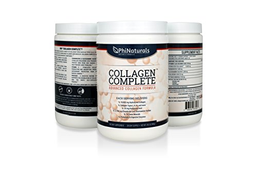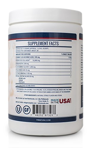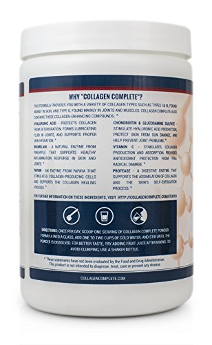 -. Feature : COLLAGEN SUPPLEMENT FOR SKIN AND JOINTS: Reduce appearance of wrinkles and support healthy skin! Support damaged or aging joints with one of the best collagen supplements for joints! / MORE THAN JUST A COLLAGEN SUPPLEMENT: Collagen Complete's other ingredients support the formation of new collagen and the protection of existing collagen in your skin, joints, nails and hair. / NATURAL FORMULA CONTAINS: Hydrolyzed Collagen Types I, II, III and MORE! (A complete collagen blend.) 10,000 mg Hydrolyzed Collagen, 2,700 mg Chondroitin and Glucosamine, 25 mg Hyaluronic Acid, 70 Trace Minerals, Proteolytic Enzymes. / BETTER ABSORPTION: Our bovine-sourced collagen hydrolysate is formulated through an enzymatic process to provide the most bio-available collagen peptides possible. / All Natural | Gluten Free | Made in USA | 100% Satisfaction Guaranteed