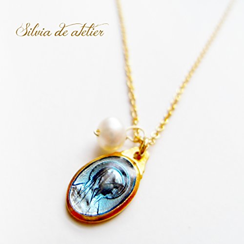 -. Title : 在庫僅少 ブルーエナメル フランス製デッドストック ミニ聖母メダイ約6×8mm 淡水パール付 14kgfゴールドチェーンネックレス(不思議のメダイ・奇跡のメダイ・マリア)