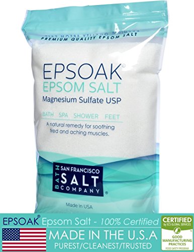 -. Feature : HIGHEST PURE QUALITY (Made in USA): Epsoak Epsom Salt (Magnesium Sulfate) is MADE IN THE USA and is Pharmaceutical grade. It is GMO free (Genetically Modified Organism) and Kosher certified. / DISSOLVES QUICKLY/GREAT VALUE: When adding Epsoak to your bath you will see why it is far superior. It is the perfectly selected grain size for dissolving very quickly & easily in warm water. It's transparent/slightly white in color and is odorless in scent. Buy in BULK and save. / RELAX MUSCLES & IMPROVE SKIN: Known for its amazing therapeutic qualities, an epsom salt bath can help to relieve muscle aches and pains, relieve aching feet, cleanse pores, flush out toxins, detoxify the skin. Mix with shower gel to create your own body scrub. / WORKS ON PLANTS AND GARDEN: Epsom Salt can do amazing things to help your Garden flourish. Epsom Salt for plants is a completely natural and cost efficient way to give them that extra boost to help your plants thrive. Use on plants, lawn, shrubs and more... / 100% MONEY BACK GUARANTEE - The San Francisco Salt Company is confident that you will be happy with the quality of our products and stand behind every single item. If you are not satisfied with your purchase return the product for a full refund. We are GMP certified.