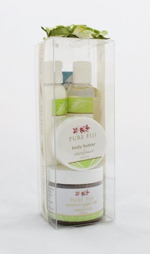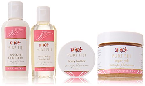 Includes a travel size Body Butter, Sugar Rub, Hydrating Body Lotion, and Exotic oil. These products were made from Fijian plant extracts and botanical ingredients. Using a soothing and calming effect, all four products are made to hydrate and condition you skin. The quality plant oils and extracts will leave your skin feeling smooth and rejuvenated.Feature