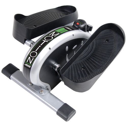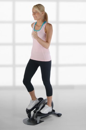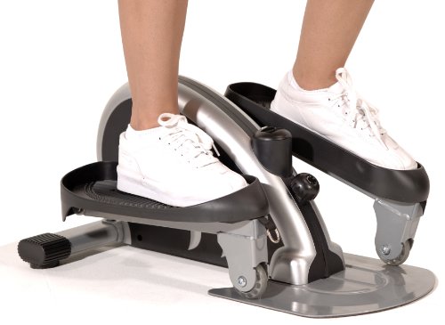 Amazon.com Product Description Forget the gym. Now you can enjoy a full cardio workout in the comfort of your home or office with this compact elliptical trainer from Stamina Products. Unlike full-size ellipticals, this trainer doesn't have arms or a front console. Instead, the trainer is essentially foot pedals only, with a chassis that's small enough to store under a desk or in a closet. Despite the small size, the trainer still packs a workout wallop, letting you burn a similar number of calories as jogging but without the risk of injury to the back, knees, hips, or ankles. Just keep your feet moving on the pedals--which continually oscillate in a low-impact manner--and you're set. Other details include sturdy steel construction, non-slip pedals, and an electronic fitness monitor that tracks the number of strides per minute, total number of strides, exercise time, and calories burned.
