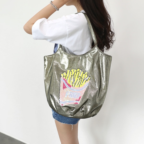 |  은은한 펄감이 도는 바디에 스팽글로 포인트를 준 쇼퍼백을 소개해드려요! 데일리룩이나 바캉스룩에 하나만 들어줘도 포인트가 되어줘서 더욱 매력적인 가방이랍니다 가볍고 부드러운 양가죽 느낌의 소재로 펄이 들어가 있어도 빳빳함이 전혀 없구요 넉넉한 크기에 원형모양의 바닥으로 디테일을 살려주어 스타일은 물론 수납까지 편리한 아이템이에요 골드, 실버, 블루 세가지 색상과 각기 다른 프린팅들이 붙어있어요 상세페이지 확인 후 굿초이스 하세요!         | COLOR | 포테이토(골드) / 팝(골드) / 콜라(실버) / 강아지(실버) / 플래시(블루) / 예스(블루) / 강아지(블랙) | | 제품 색상은 모니터에 따라 실제 색상과 차이가 있을 수 있습니다. | | | | FABRIC | 폴리혼방 | | | | PRODUCT ION | 제조국 / 중국 | | 품질보증기준 / 소비자분쟁 해결기준에 따름 | | A/S 책임자 및 고객센터 / 감성가방 | | | | SIZE INFO | 사이즈는 측정 방법에 따라 1~2cm의 차이가 있을 수 있습니다. | | 스트랩 길이는 연결 고리를 제외한 길이이며, 최대 길이입니다. | | (단위:cm, g) | | 가로 길이 | 세로 길이 | 너비 | 손잡이 높이 | 스트랩 길이 | 무게 | | 41.5 | 38.5 | 17 | 21 | - | 280 |  |