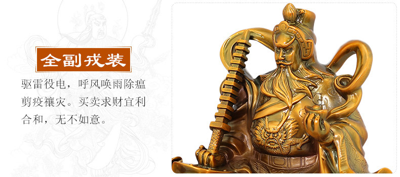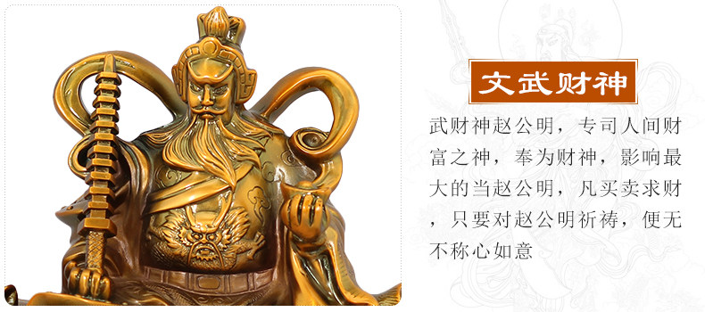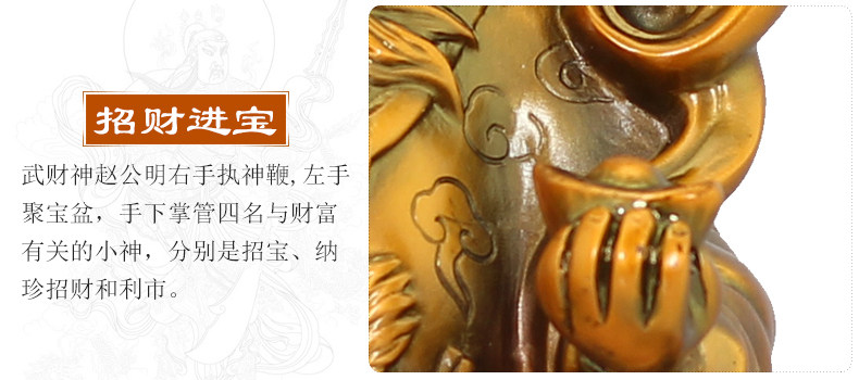 商品特点:相传“日精”所托化为武财神。在《封神演义》中,姜子牙封赵公明为“金龙如意正一龙虎玄坛真君”,简称“玄坛真君”,统帅“招宝天尊萧升”、“纳珍天尊晋宝”、“招财使者邓久公”、“利市仙官姚少司”四位神仙,专司迎祥纳福、商贾买卖。