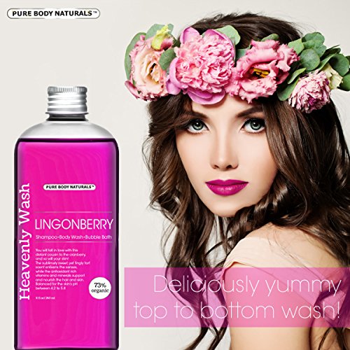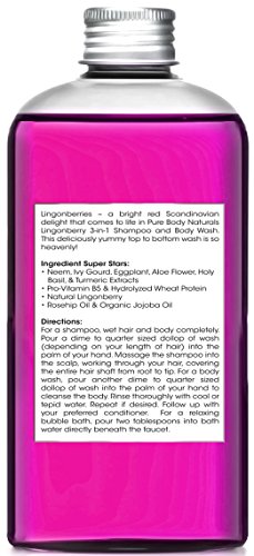 -. Feature : Pure Body Naturals Lingonberry Shampoo, Body Wash & Bubble Bath; Contains powerful ingredients such as neem, ivy gourd, eggplant, aloe flower, holy basil, turmeric extracts, pro-vitamin B5, hydrolyzed wheat protein, natural lingonberry, rosehip oil, and organic jojoba oil; paraben-free / Lingonberry, Scandinavian super fruit, is refreshing, natural antioxidant rich fruit that known to help delay skin aging and maintain skin's firmness. / PERFECT FOR SENSITIVE SKIN: Great for all skin types and all ages. Our lingonberry shampoo and body wash helps cleanse and protect sensitive skin with powerful antioxidants that will neutralize radiation from the sun while removing any pollutants and chemicals from the skin. / RELAXING BUBBLE BATH: Submerge yourself in a bath that is relaxing, detoxifying and nourishing! The sublimely sweet, yet tingly tart scent enlivens the senses, while the antioxidant rich vitamins and minerals support and nourish for healthy and flawless skin. / TRY IT RISK FREE: With thousands of satisfied customers and a long line of best-selling products, we're eager for you to join the Pure Body Naturals family! We promise that the benefits of our shampoo and body wash aren't too good to be true. But if you need a little extra assurance, each purchase comes with our money back guarantee! If for any reason you're not happy with the results, you can return it for a full refund.