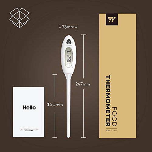 Simple One Button Operation Function 1: Press the Power / Function Button once to power on the thermometer and start using. Function 2: Press the Power / Function Button once to lock the temperature reading. Press again to unlock. Function 3: When on, press the Power / Function Button twice to enter different measuring modes. Press again to cycle through Max / Min / Normal mode, in these modes, the unit will not automatically power off. Press the button twice again to exit measuring mode and resume the auto power off function. Function 4: When the unit is on, press the Power / Function Button three times to switch between °C and °F. FDA Certification (For your family) This food thermometer is completely FDA certified and 100% safe. Serve your dishes with complete confidence in not only their deliciousness but also their safety. 40% Larger Screen Check in on your Sunday roast's status with just a short glimpse of an eye. Thanks to the extra-large 1.8 inch screen on the small body of the thermometer, it is easy as 1-2-3 to monitor the situation on all your meats so you get that rosy pink center while the outsides is crisply seared. Next Level BBQ Master Treat yourself and your guests to an extravagant BBQ party and leave everyone longing for the next one. Thanks to its wide temperature range of -58°F ~ 572°F / -50°C ~ 300°C , you can sear steaks at that ideal 450°F / 230°C point or slow cook your ribs into tender goodness so they fall straight off the bone at 140°F / 60°C. Protective Sheath The convenient plastic cover will not just ensure that the thermometer stays clean while not in use, but also that its functionality is protected. Simply glide on the pen clip casing after you have finished cooking your 5-star menu and rest assured that the thermometer can be stored worry-free. 0 |
