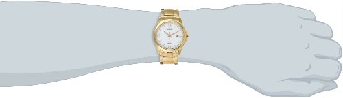 - Feature : Gold-tone watch in stainless steel with logo on dial, two-tone bracelet, and alternating Roman numeral and stick hour markers / Japanese quartz movement with analog display / Eco-drive is fueled by light so it never needs a battery / Features protective mineral crystal dial window, date window, and fold-over clasp / Water resistant to 330 feet (100 M): suitable for snorkeling, as well as swimming, but not diving