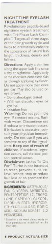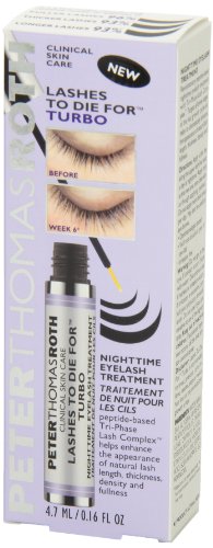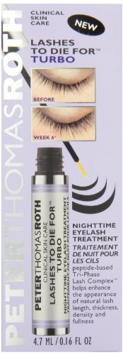 -. Binding : Health and Beauty -. Brand : Peter Thomas Roth -. Department : Beauty -. EAN : 0793379312941 -. Feature : Revolutionary peptide-based nighttime eyelash treatment with Tri-Phase Lash Complex. / Targets all three stages of the hair growth cycle and helps to dramatically enhance the appearance of natural lash length, thickness, density and fullness. / Tri-Phase Lash Complex targets all three stages of the hair growth cycle.Ophthalmologist tested.Will not discolor eyes or eye lids.Irritation free. -. IsAdultProduct : 0 -. Label : Peter Thomas Roth -. Manufacturer : Peter Thomas Roth -. Model : 172472 -. MPN : 24-01-577 -. NumberOfItems : 1 -. PackageQuantity : 1 -. PartNumber : 24-01-577 -. ProductGroup : Beauty -. ProductTypeName : HEALTH_PERSONAL_CARE -. PublicationDate : 2013-10-31 -. Publisher : Peter Thomas Roth -. ReleaseDate : 2013-08-01 -. Size : 4.7ml/0.16oz -. Studio : Peter Thomas Roth -. Title : Peter Thomas Roth Lashes To Die for Turbo Nighttime Eyelash Treatment, 0.16 Ounce -. UPC : 885105197554