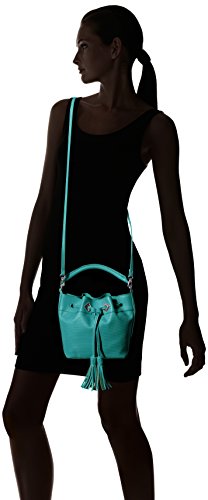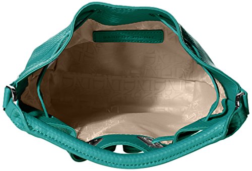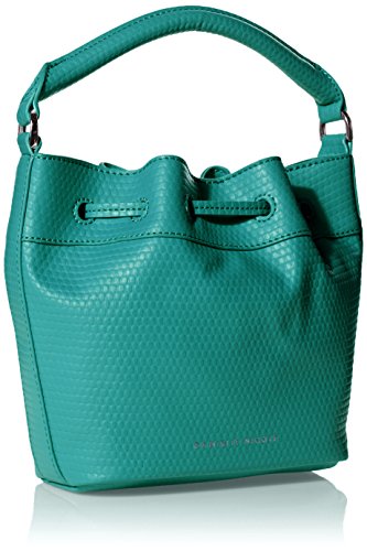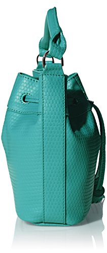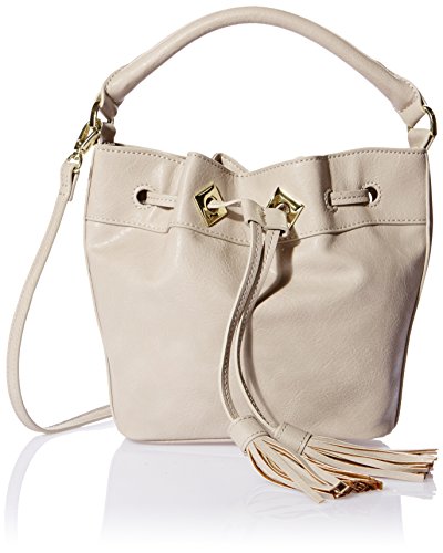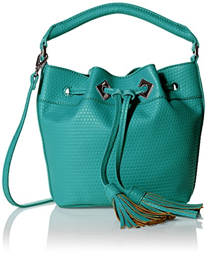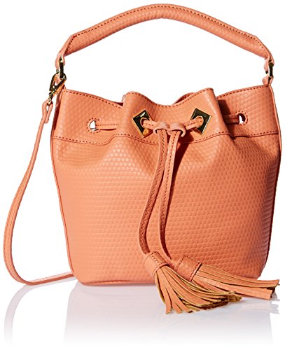 Miniature bucket silhouette features textured body materials and a removable cross body strap.