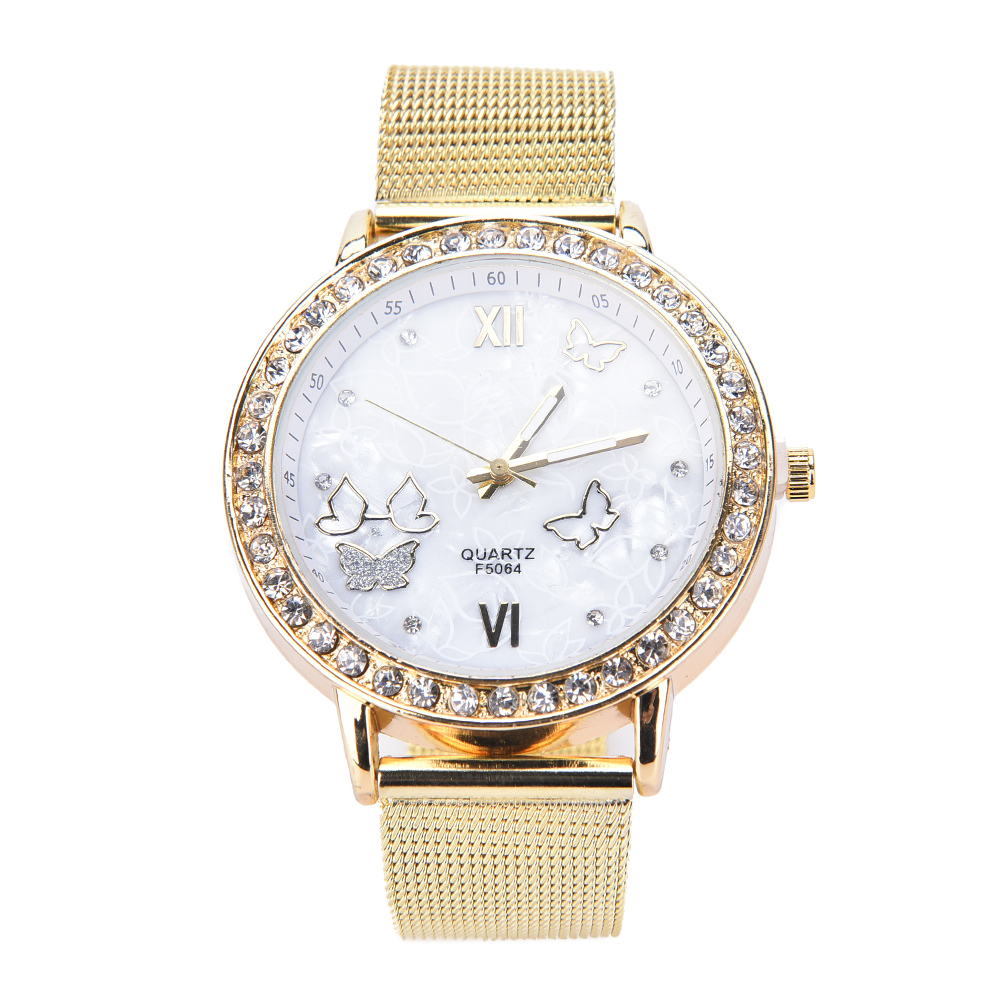 Women Ladies Crystal Butterfly Gold Stainless Steel Mesh Band Wrist Watch