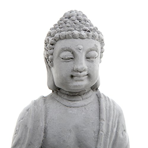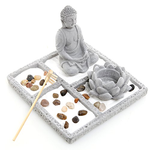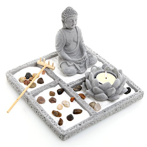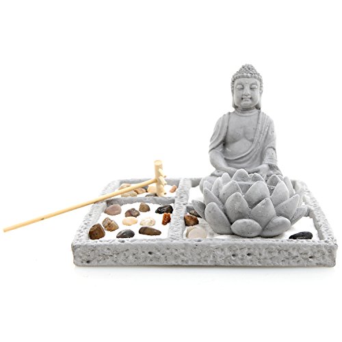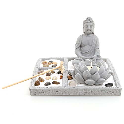 Deluxe Gray Cement Rustic Zen Buddha Statue Garden Set with Lotus Tealight Candleholder, Sand, Rock & Rake