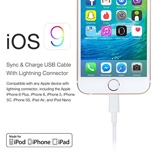 Apple MFI Certified Charging and Synching Lightning Cable for Ulitmate Conveniece For Apple iPhone SE,iPhone 6s, iPhone 6s Plus,iPhone 6, iPhone 6 Plus, iPhone 5s, iPhone 5, 9.7 inch iPad Pro, 12.9 inch iPad Pro, iPad Air 2, iPad Air, iPad Mini 4, iPad Mini 3, iPad mini 2, iPad mini, iPad 4, iPod Touch 5th, Nano 7th Generation