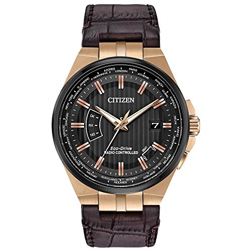 -. Feature : From the Citizen Eco-Drive Collection, the World Perpetual A-T watch brings a new confidence to an old style / Designed with a brown leather strap, this classic watch features a 42mm rose gold toned stainless steel case / The black dial features a date window and atomic timekeeping technology with synchronized time adjustment / Powered by any light, this timepiece will never need a battery / Wear this watch on your next outing.Three-hand quartz movementRound stainless steel 42mm rose gold caseBrown leather strapBlack dial with date window and atomic timekeeping technologyAvailable in 26 time zonesWater resistant up to 100mSolar poweredCitizen Style #: CB0168-08E