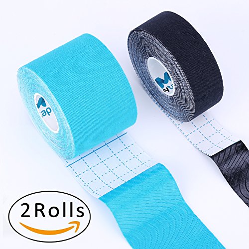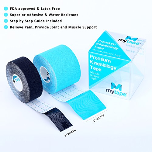 Kinesiology Tape Pro,Muscle Support Adhesive,Physio Therapeutic Recovery Sports Athletic Aid,Mytape,2 Uncut Rolls(2"W x 16.4'L / 1"W x 16.4'L, Blue / Black)
