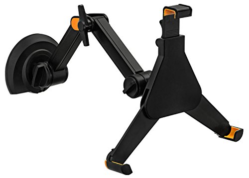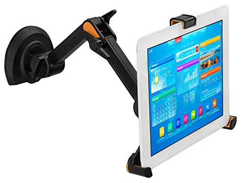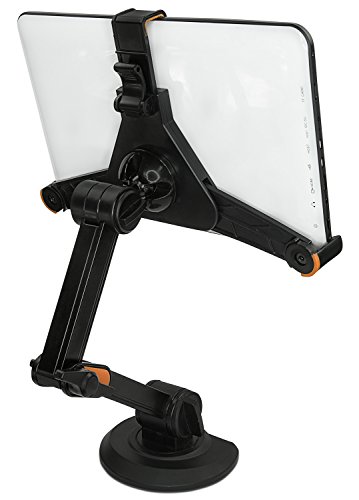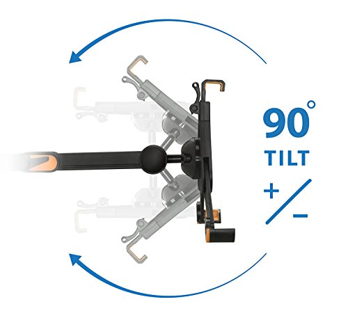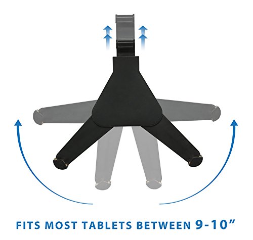 -. Feature : Wall, under cabinet or desk mount for all iPad models, 8.9"-10.4" Galaxy and other tablets / The three legs that hold the tablet can be individually adjusted to fit any tablet up to 10". The top leg extends and retracts, while the two bottom legs can swing. The edges of the legs come with protective padding to prevent scratching your tablet. / Full motion capability. Both the tablet holder and the base can rotate 360 degrees. Each arm joint can articulate up to 100 degrees. Once the desired joint angle is achieved, tighten the joint with the knobs to secure the tablet in position. / With both arms fully extended, the distance between the base and the tablet holder legs measure approximately 10 inches. / Tablet holder tilts 30 degrees for ideal viewing angle for under cabinet, wall or desktop installation
