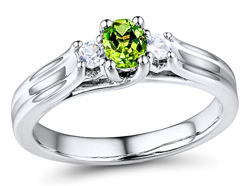 -. Feature : Lovely 3-Stone Peridot Ring / 5x4 MM Oval Peridot (treated) / 2 Round Lab Created White Sapphires 2.5MM Each / Classic 3-Stone Style / Rhodium Plated Sterling Silver
