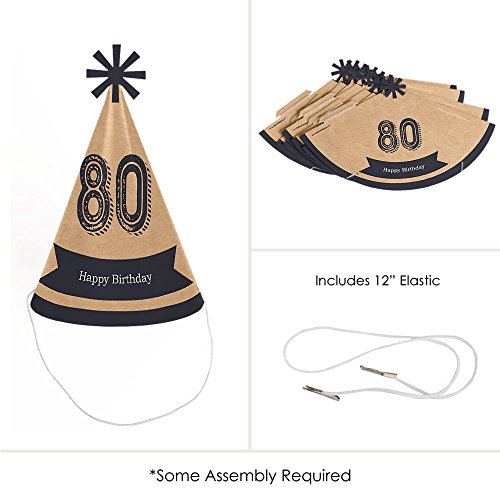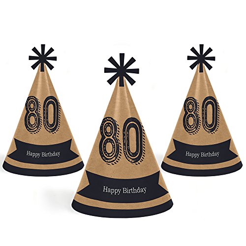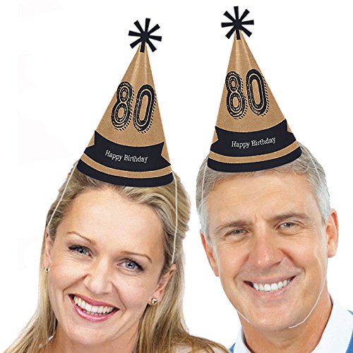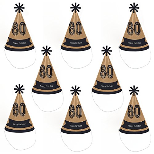 -. Feature : 80th Milestone Birthday Party Hats INCLUDES 8 cone-shaped Dashingly Aged to Perfection 80th Milestone Birthday party hats for adults with decorative top and elastic chin straps. 80th Milestone Birthday party hats are a larger size but will fit both children and adults. / 80th Milestone birthday party hats SIZE 8.5 inches tall and 5.5 inches in diameter at the base. The included elastic chin straps measure 12 inches long. Each of these fun vintage 80th birthday party hats feature a unique star cut-out decoration at the top and P.R.Inted "Happy Birthday" on the front / FUN BIRTHDAY PARTY SUPPLIES: 80th Milestone Birthday - Dashingly Aged to Perfection cone party hats are perfect for your male 80th birthday party. This set of cute party hats will help you take memorable party photos. They are sure to be enjoyed by all your friends and family - and the guest of honor! / PREMIUM PARTY HATS: Set of 8 80th Milestone Birthday party hats are professionally P.R.Inted on heavy-duty cardstock paper with a photo-like shine. They are individually inspected, then carefully packaged. 80th Milestone Birthday cone party hats will arrive flat, with the chin straps attached. Easy assembly is required. Simply roll the party hat into a cone shape and slide the tab into the slot to secure. / MADE IN THE USA: 80th Milestone Birthday - Dashingly Aged to Perfection - Cone Birthday Party Hats are designed and manufactured at our Wisconsin facility using materials that are Made in the USA.