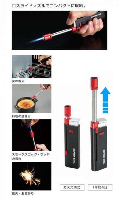スライドノズルでコンパクトに収納できます。 製造国:日本 素材・材質:本体:ABS樹脂パイプ:ステンレス鋼炎口:亜鉛合金 商品サイズ:(約)30×15×全長115~175mm 重量:約45g 仕様:ガス容量:約1.4gガス充填式1年間保証(台紙裏記載あり) ※サプライヤー直送品 ご注文後3~4営業日後の出荷となります【商品名】CAPTAIN STAG キャプテンスタッグ スライド ミニトーチ UF-16