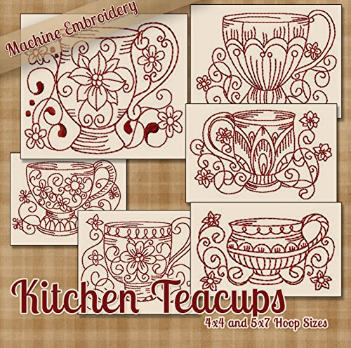 Kitchen Teacups Redwork Machine Embroidery Designs on CD
