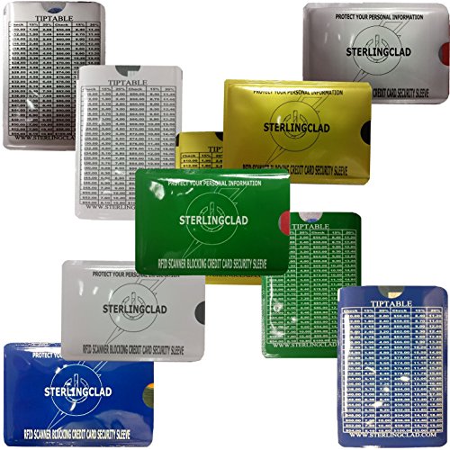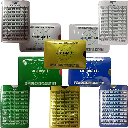 RFID Blocking Sleeves with Tip Table-LEAVE YOUR WALLET AT HOME-Organized 5 colors -Each Metallic sleeve holds and protects 2 cards and 5 bills.