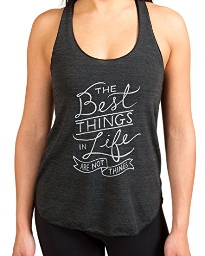 -. Binding : Apparel -. Brand : Inner Fire -. Color : Black -. Department : womens -. Feature : The best things in life are not things... as all wise yogis know - spread the love and inspire others in the studio or on the streets! / American Apparel racerback tank made in USA is a tri-blend of polyester, cotton and rayon / Super soft, comfortable racer back style is versatile and flatters every body type / Hand-screen P.R.Inted with love in Canada using eco-friendly water-based ink / Style runs small: Chest width (S: 13.5" - M: 14.5" - L: 16"); Center front body length (S: 18" - M: 18.5"; L: 19.25") -. ProductGroup : Apparel -. ProductTypeName : SHIRT -. Title : Inner Fire "The Best Things in Life Are Not Things" Yoga Racerback Tank Top