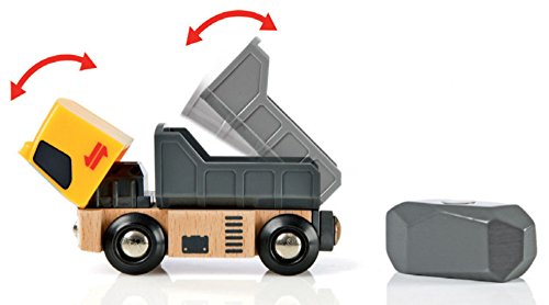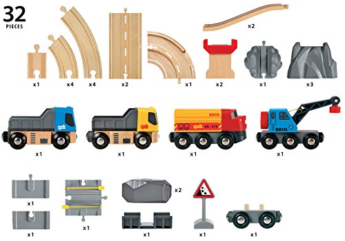 -. Feature : 32 pieces; train with special crane car and flatbed, 2 trucks, 2 magnetic boulders / Special pivoting, magnetic train crane car loads and unloads cargo / Train crossing road section with working safety gates / Wooden trestle sections and unique "rock" track / For ages 3+