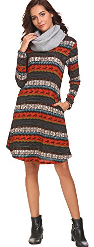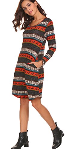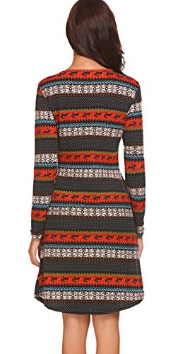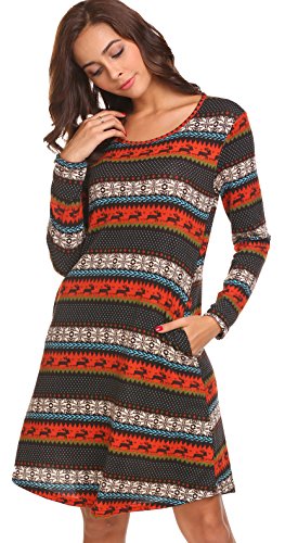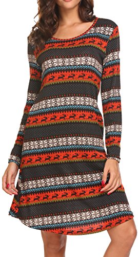 Women's Christmas Dress Printed Long Sleeve Skater Flared Dresses Brown S