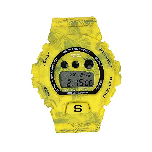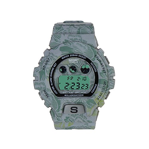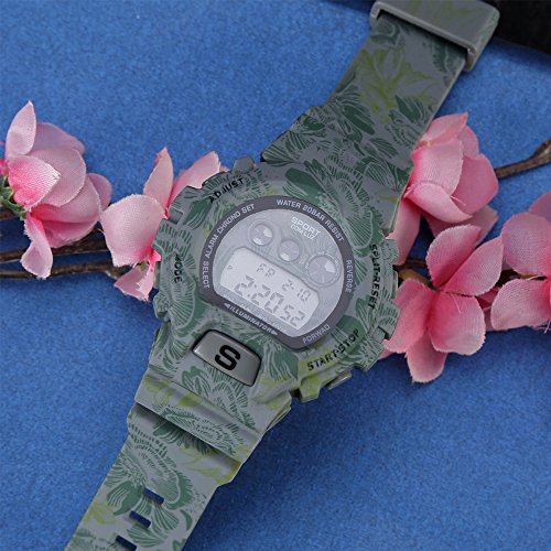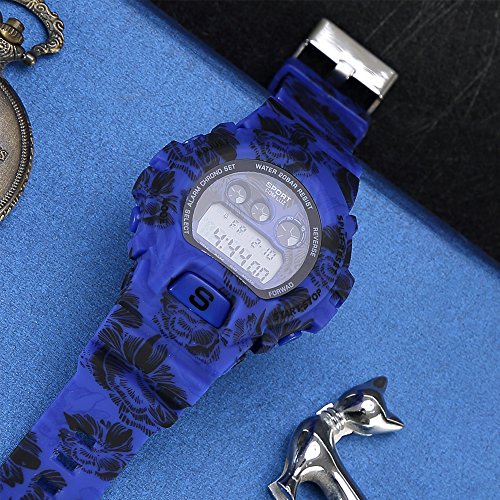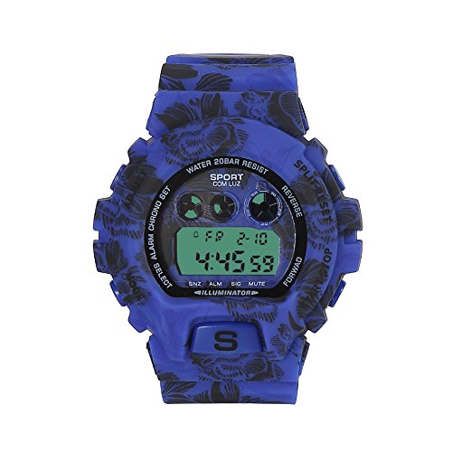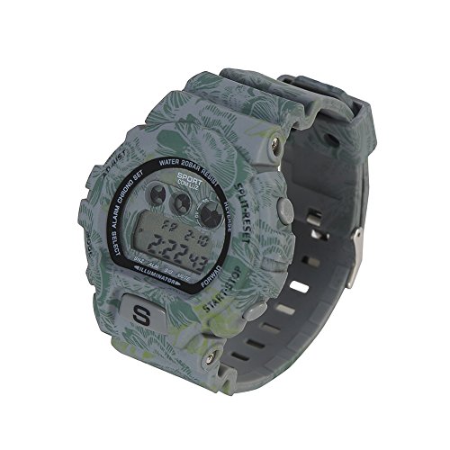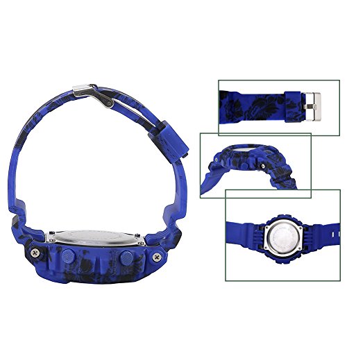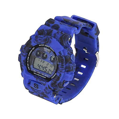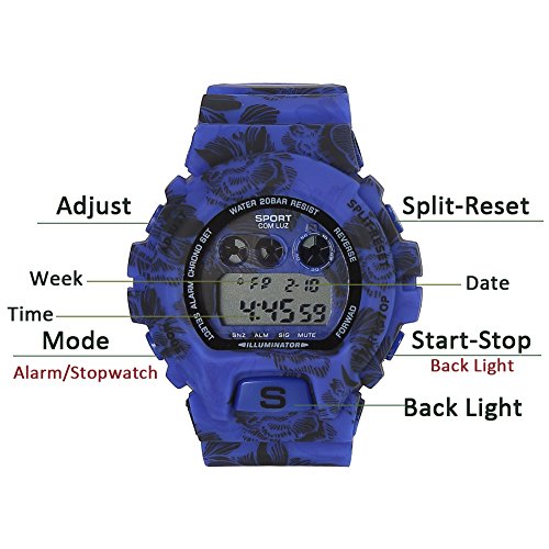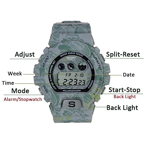 -. Feature : Fashionable design.The stylish watch with beautiful pattern is very suitable for all occasions and all kinds of people.The high quality imported quartz movement provides precise and accurate time keeping. / Multifunction.It has 12/24 hour system, Alarm clock,Stopwatch,week/day/month,back light. The back light shows time clearly in the dark and the "S" Button can make you see the time conveniently. / Suitable for sports.The large dial and numbers make you watch time easily.The light material will not make you feel tired when you wear the watch for a longtime.The digital watch makes you perfect for daily use and outdoor activities. / Durable&Comfortable band.It is made of Silicone,which is very soft and not easy to allergy.It is suitable for your wrist because it has enough length to adjust the right size. / Daily waterproof.You can wash your hands with the watch.Please keep the watch away from the stream and hot water and do not operate it under the water.