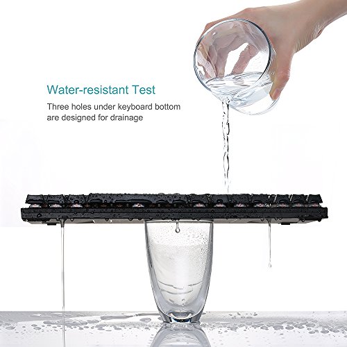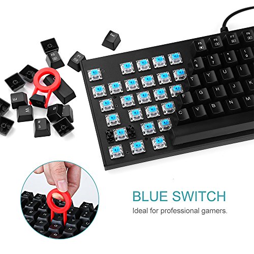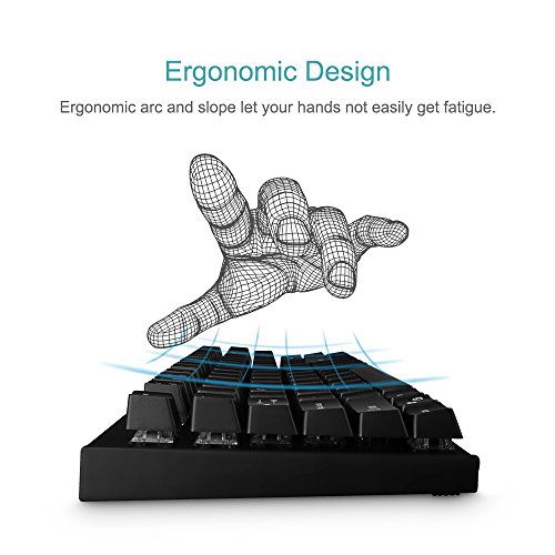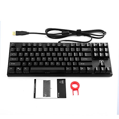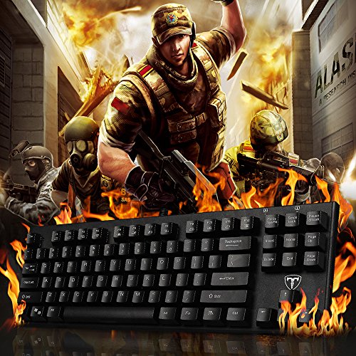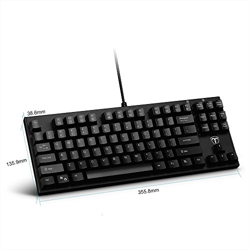 - Feature : Anti-ghosting 87 Keys. N-key rollover. Allowing multi-keys to work simultaneously with high speed. Each key is controlled by independent switch, let you enjoy high-grade games with fast response. / Blue Switchs. Custom mechanical switches designed for longevity, responsiveness, and durability. Mechanical keys with medium resistance, audible click sound, and tactile feedback. 50 million times keystroke test, 60±15 grams keystroke force and 4.0±0.2mm keystroke travel. / Waterproof. Made of top-graded ABS and metal material, with matte-finish texture and laser engraving key characters, it is sturdy and robust for durability. It is water-resistant with three drain holes. / Key Shortcuts and Ergonomical design. Easy to access to calculator, email, web browser, volume, media etc with FN+F1-F12. Ergonomical design: the stepped keycap makes it sleek and thearc and slope fit your hands easily to prevent fatigue. / Durability and Wide Compatibility. Laser carving character key for long time use. Made of top-grade ABS and metal material, with matte-finish texture, it is sturdy and robust. Compatible with Windows10,Windows 8,Windows 7,Mac OS X,Windows XP, Windows VISTA.