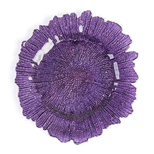 Binding : Kitchen Product Description As the name implies, these magnificent purple chargers are inspired by the intricate details of coral reef. Stunning 13 inch Purple Coral Glass Charger Plates provide polished detailing to event tables at weddings, parties, and other celebrations. For holidays and entertaining, chargers add the elegant touch that make your guests feel special. As a base for dinner plates, impressive purple chargers remain after the dinner plates are removed, maintaining the beautiful tablescape. Just as natural coral is formed in many shapes and sizes, these plate chargers each have unique scalloped characteristics, making none exactly alike. 4 glass chargers per pack. 0