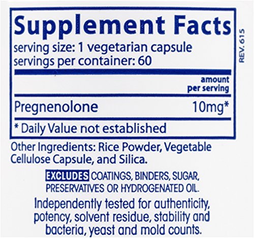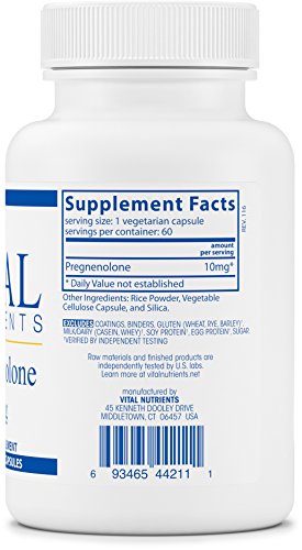 ReleaseDate : 2015-07-14 Studio : Vital Nutrients Publisher : Vital Nutrients Binding : Health and Beauty Product Description Pregnenolone is synthesized in the body from cholesterol and is the precursor for all the steroid hormones, including progesterone, aldosterone, cortisol, dehydroepiandrosterone (DHEA), testosterone, and estrogens. The endogenous production of Pregnenolone begins to decline after age 35. Supplementation with Pregnenolone helps support mood, well-being, memory and immune function. It has been suggested this hormone may play a role in the neuroendocrine response to stress. Vital Nutrients mission is to manufacture superior quality nutraceuticals that exceed both industry and government standards and provide clinically effective results. They provide over 200 science-based and clinically effective products. They have a comprehensive quality assurance program to ensure that purity and potency is consistently met on every product that they manufacture. Vital Nutrients uses independent U.S. ethical laboratories to test all raw materials and finished products. Each raw material is tested, regardless of origin, for purity and potency. All finished products are tested through a real time stability protocol for expiration date validation. They are an FDA Inspected facility that exceeds FDA cGMPs, and a member of the NPA. 0