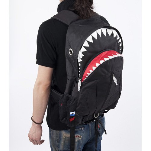-. Feature : 迫力満点の大きな口と歯 サメの真っ赤なお腹の中には、ファスナー付きのポケットとメッシュポケットが装備されています / 収納場所は上あごと下あごの2箇所で、荷物をたっぷり収納できます。 大きな口はダブルジッパー仕様になっており、荷物の出し入れが容易です。 / ショルダー部分や背面に柔らかいパッドが入っているので、負担を軽くしてくれます。 ショルダーストラップは、ズレ落ちないようバックルで前止・連結できます。 / 両サイドのエラ部分もマジックテープ付きのポケットになっているので、小物を収納できます / ジッパーの チャームは魚です。